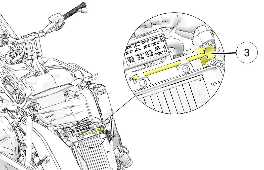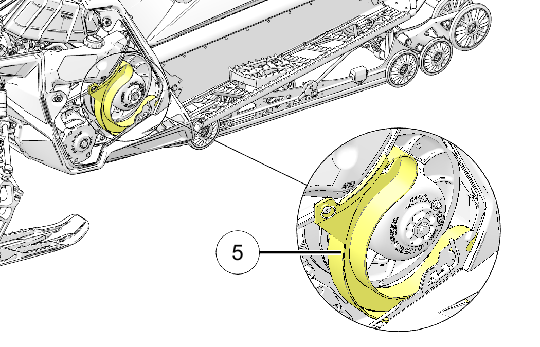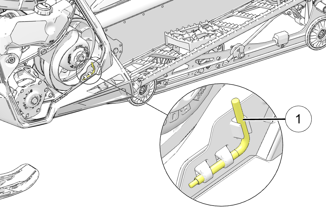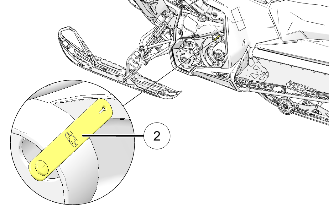 A driven clutch L-wrench and a spare belt holder are provided with the snowmobile. The spare belt holder has provisions for two spark plugs and is secured to the front bumper with the spark plug wrench. Open the left side panel and hood to access the tools.