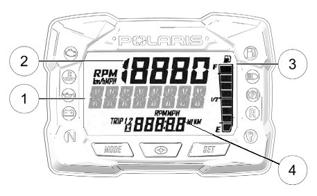 4 Odometer/Engine Hour Display - This area displays the odometer, Trip A, Trip B and engine hours.