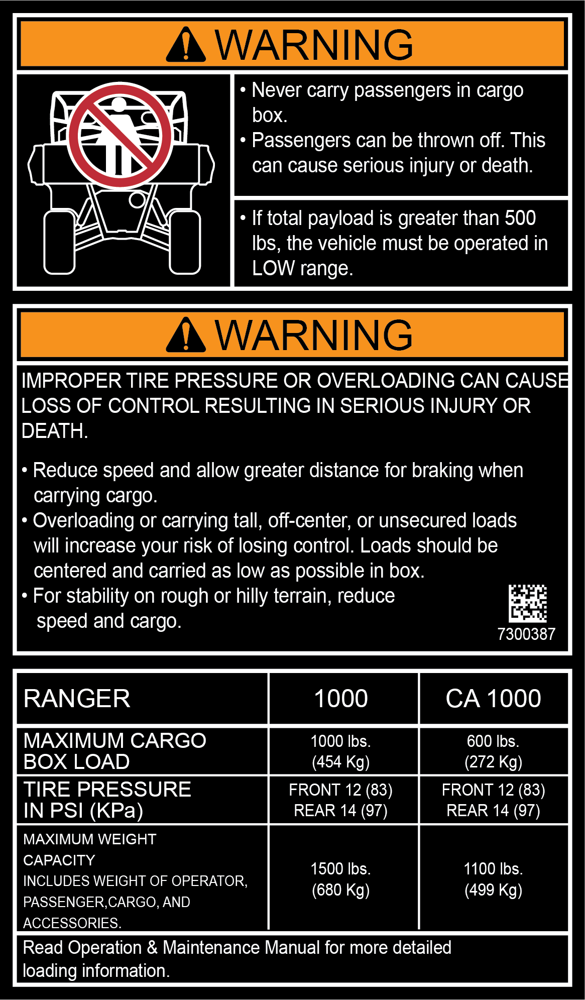 L’étiquette d’avertissement pour passager/pression des pneus est située sur la benne de chargement.