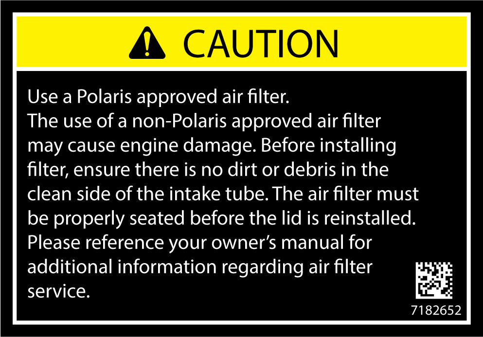 Utiliser un filtre à air approuvé par Polaris. L’utilisation d’un filtre à air non approuvé par Polaris peut gravement endommager le moteur. Avant d’installer un filtre, s’assurer que le côté propre du tuyau d’entrée d’air est exempt de toute souillure ou de tout débris. Il faut correctement installer le filtre à air avant de replacer le couvercle. Consulter le manuel d’utilisation pour tout renseignement additionnel concernant l’entretien du filtre à air.