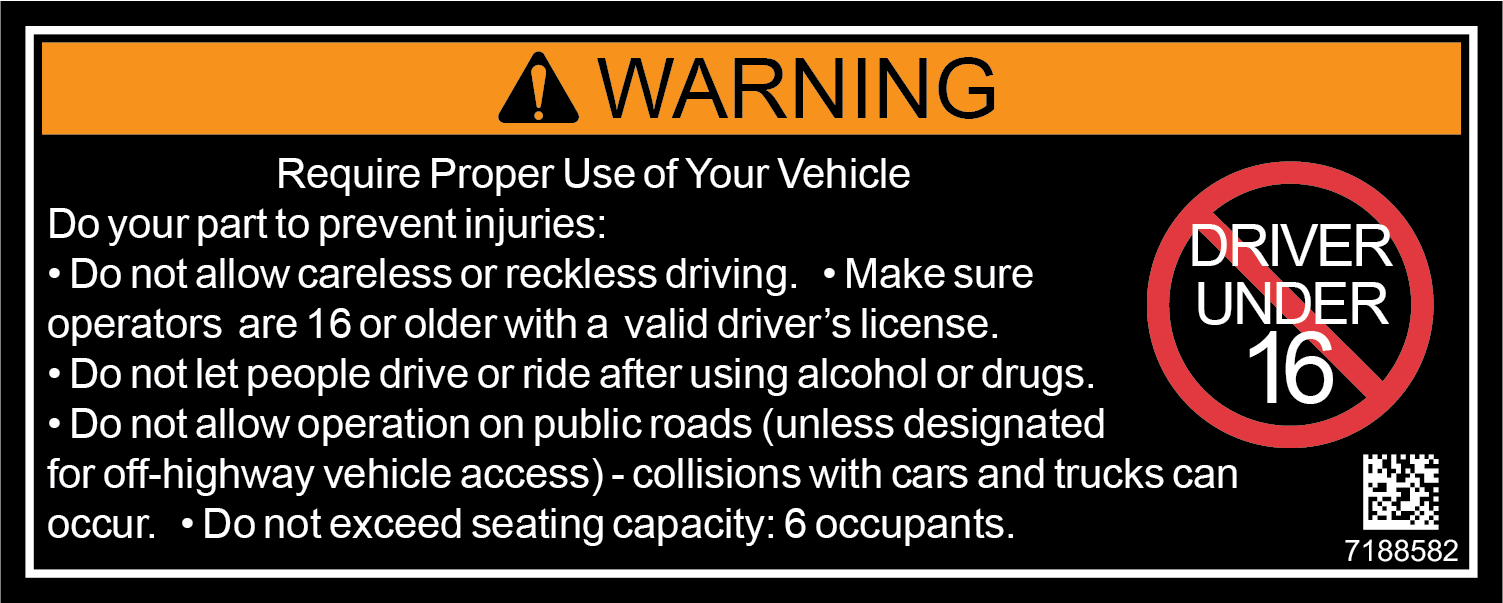Ne pas autoriser la conduite sur des voies publiques (à moins qu’il ne s’agisse de routes identifiées accessibles aux véhicules tout-terrain) – le véhicule pourrait entrer en collision avec des voitures ou des camions.
