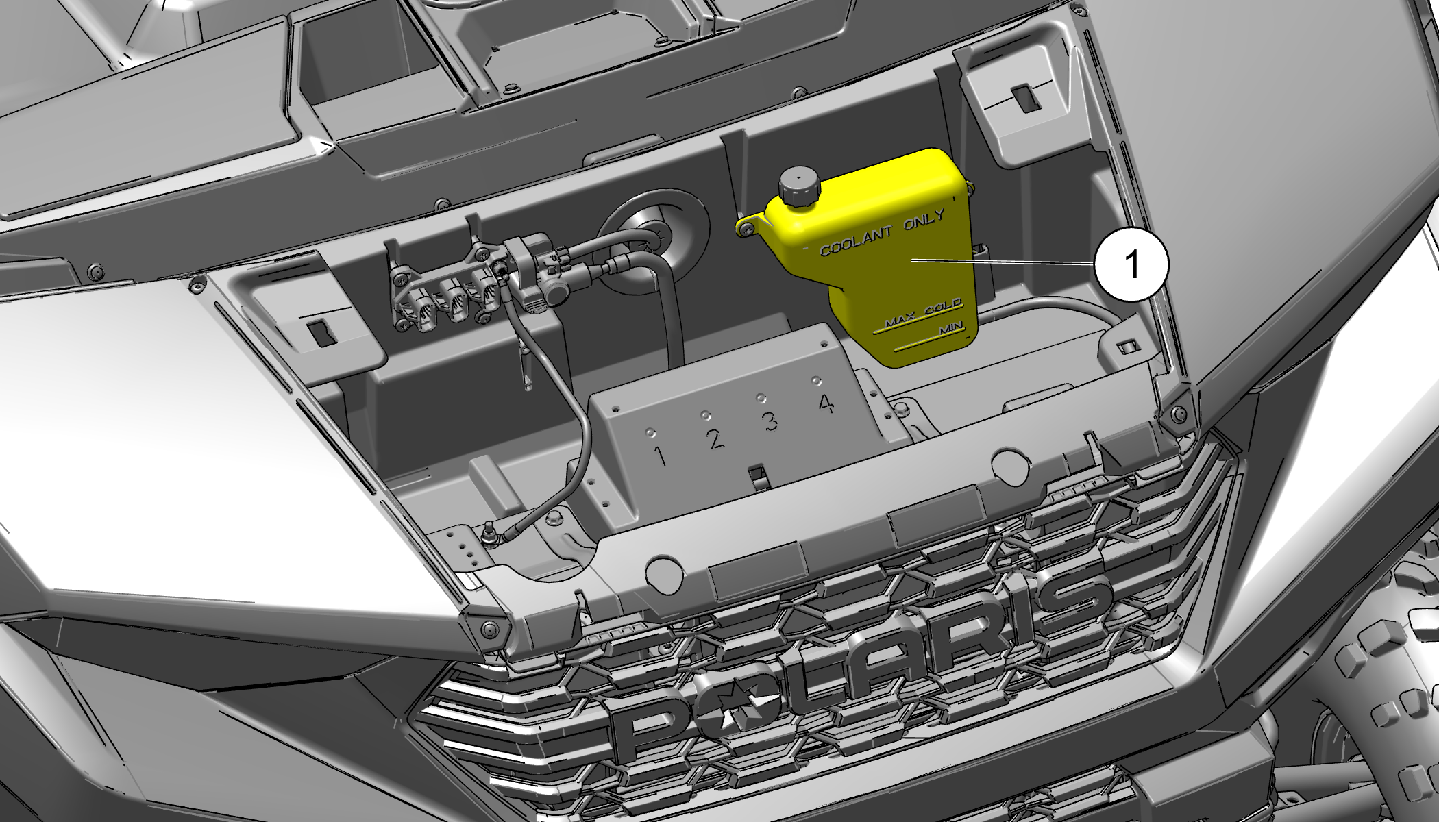 Toujours vérifier et vidanger le liquide de refroidissement aux intervalles indiqués dans le Tableau d’entretien périodique de POLARIS. Conserver le niveau du liquide de refroidissement entre les repères minimum et maximum du vase d’expansion (lorsque le liquide est froid).