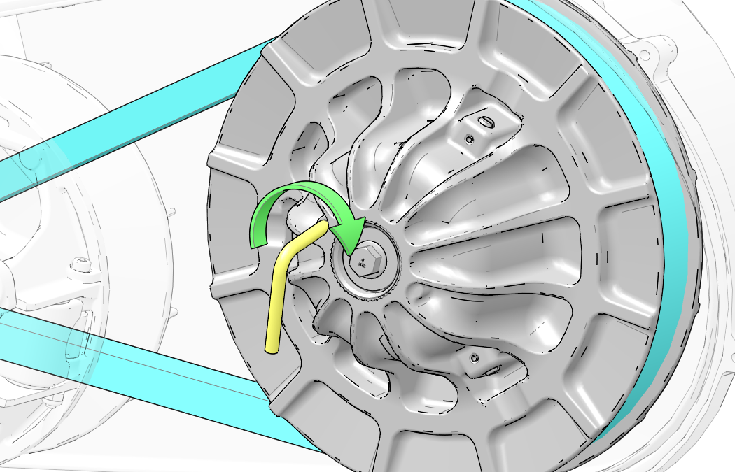 Tourner l’embrayage à poulie menée et la courroie cinq à sept fois environ pour que la courroie soit correctement installée dans l’embrayage à poulie menée.