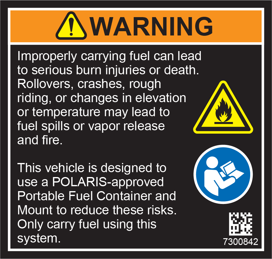 Ce véhicule est conçu pour s’utiliser avec un contenant de carburant portable et un support approuvés par POLARIS afin de réduire ces risques. Ne transporter du carburant qu’à l’aide de ce système.
