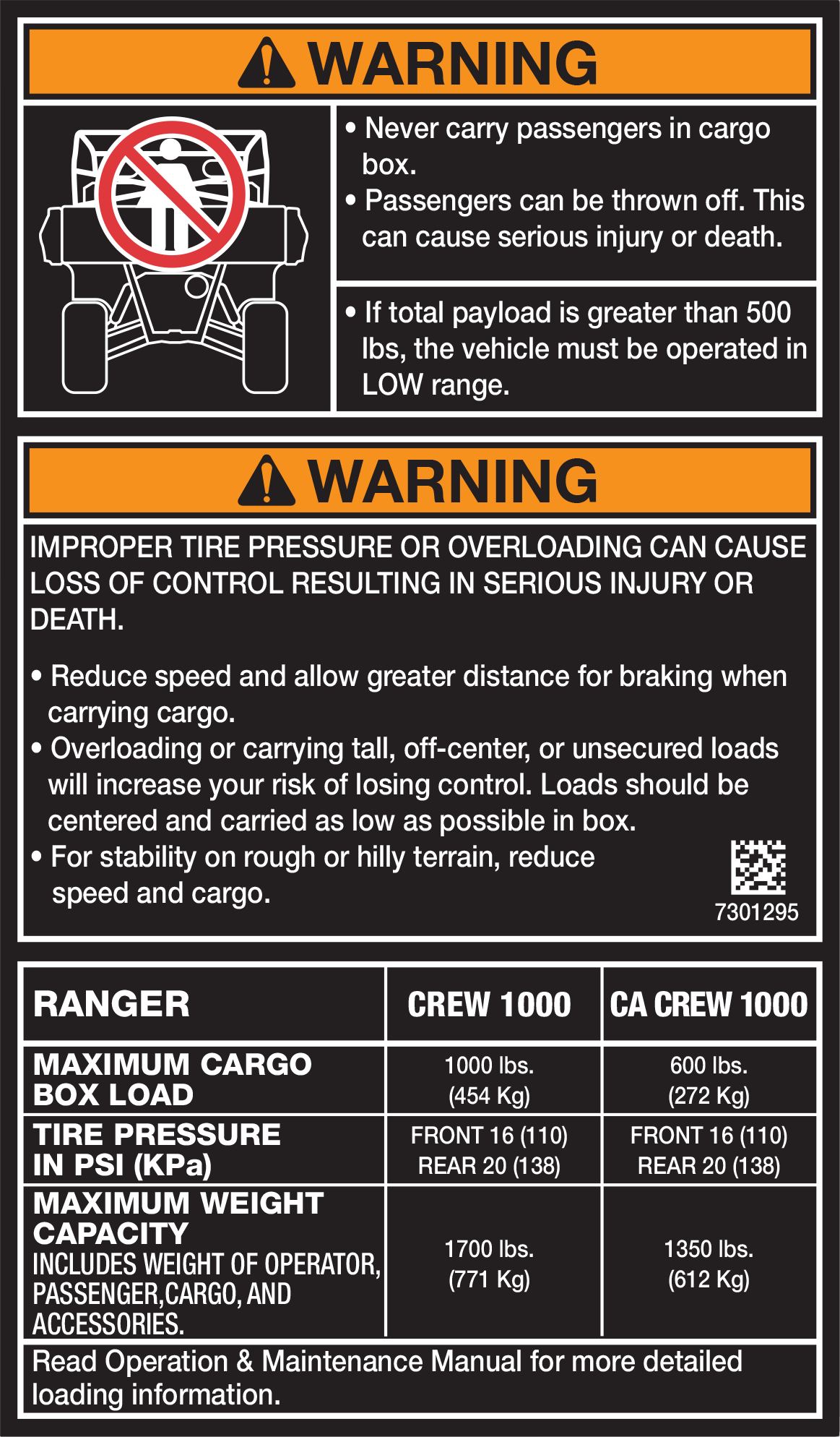 UNE PRESSION INCORRECTE DES PNEUS OU LA CHARGE DU VÉHICULE PEUT CAUSER LA PERTE DE CONTRÔLE ET ENTRAÎNER DES BLESSURES GRAVES OU LA MORT.