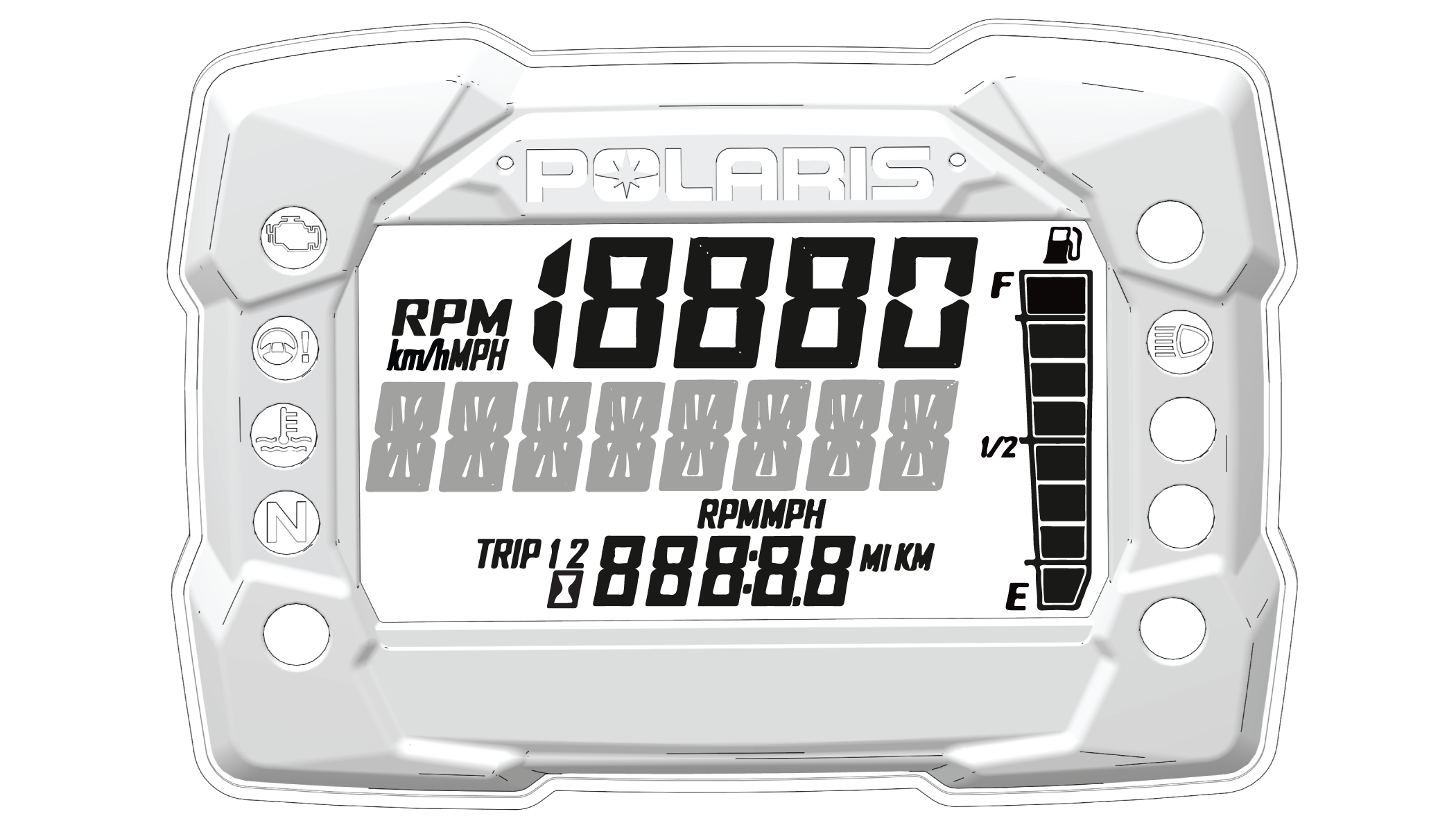 Some Sportsman models are equipped with a no-button gauge. This gauge style does not come equipped with a clock feature. Other available features may vary.