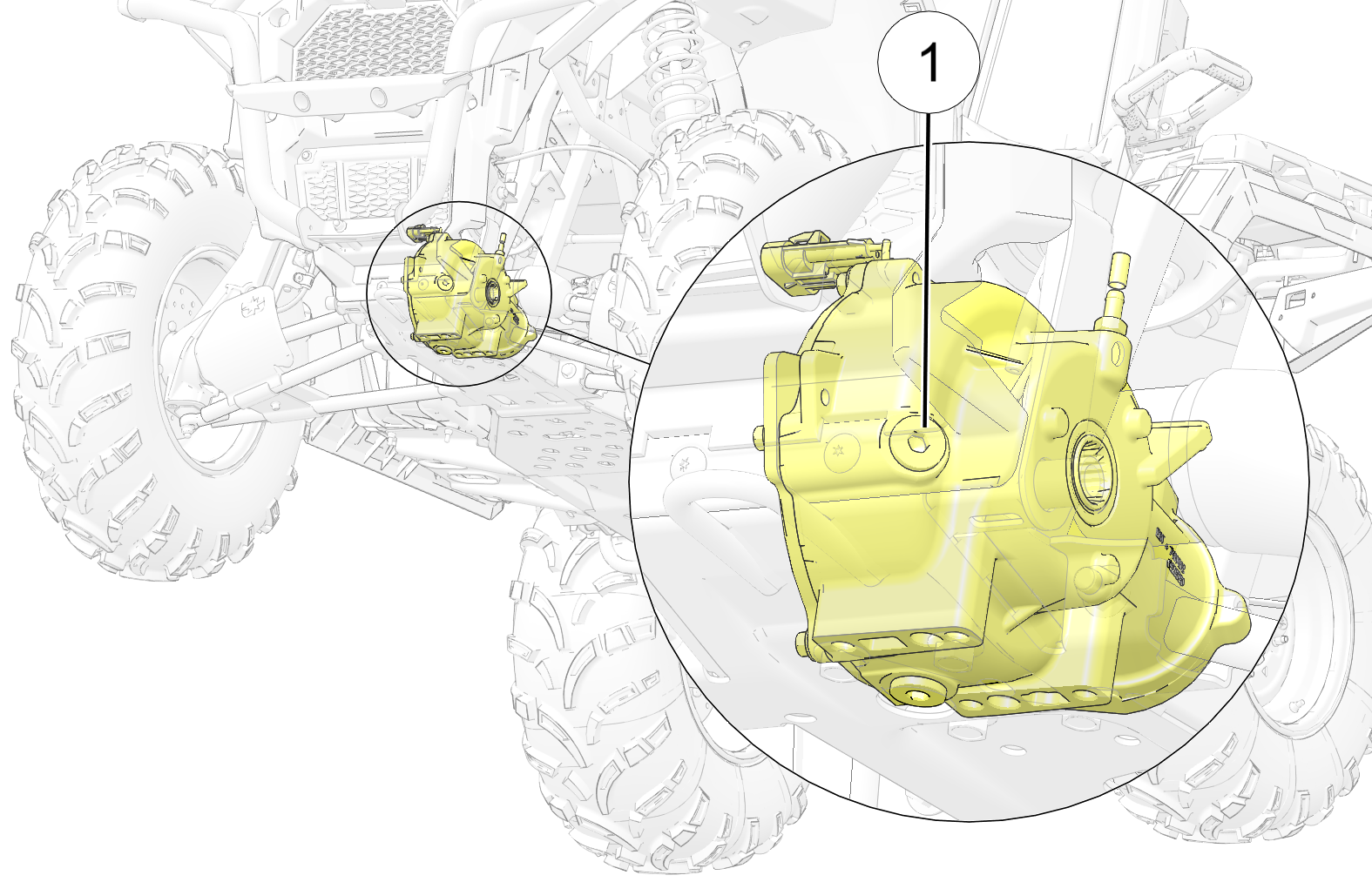 Use the recommended fluid. Use of other fluids may result in improper operation of components. Maintain the fluid level at the bottom of the fill hole threads. The fill plug is located on the right side of the front gearcase. The drain plug is located on the bottom of the front gearcase and can be accessed through the bottom of the chassis.