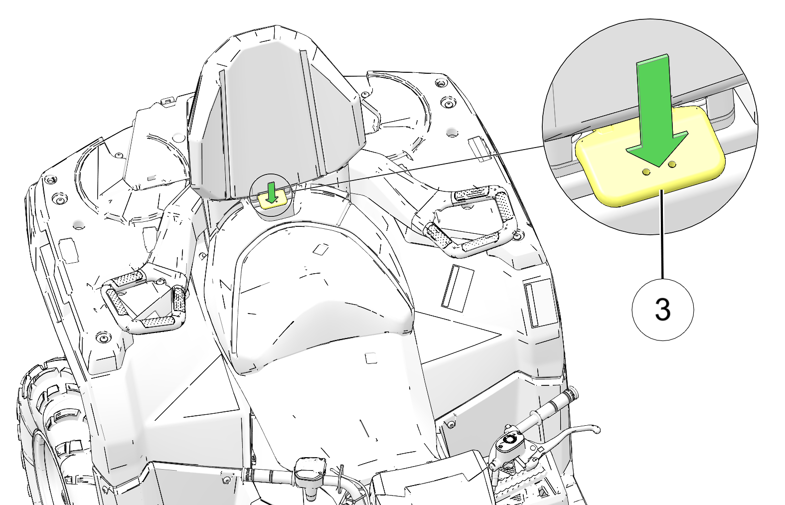 Install the passenger seat onto the vehicle by pushing back on the backrest and down on the passenger seat latch lever 3 until you feel and hear a click.