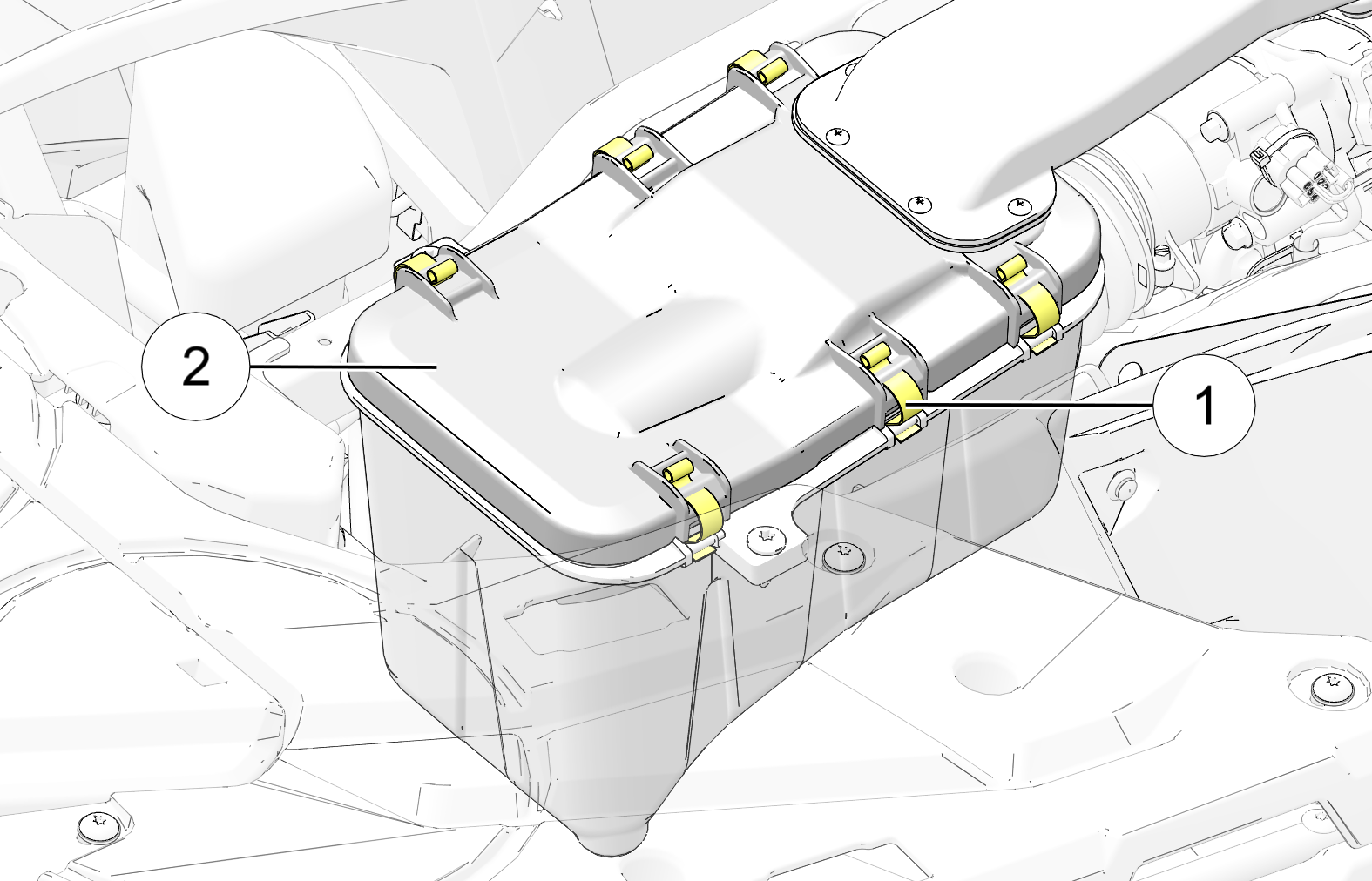 Remove the six clips 1 from the air box cover and remove the cover 2.