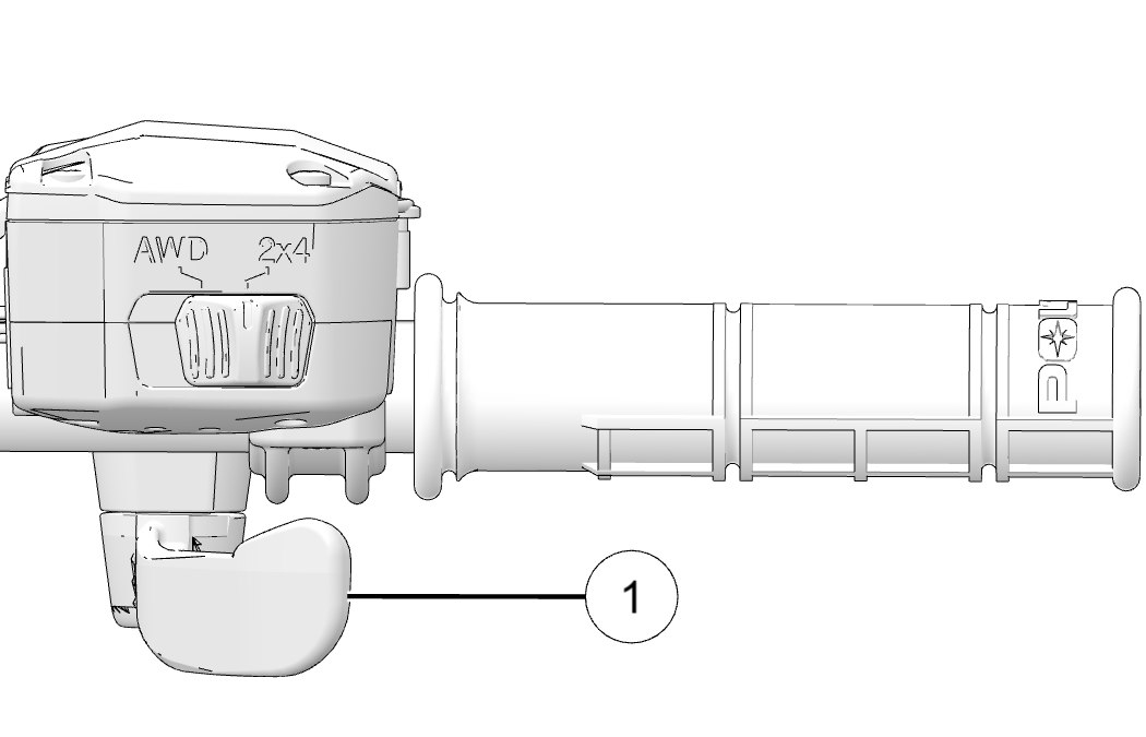Engine speed and vehicle movement are controlled by pressing the throttle lever 1. The throttle lever is spring loaded. Engine speed returns to idle when the lever is released. This ATV is equipped with a throttle release switch, which is designed to reduce the risk of a frozen or stuck throttle.