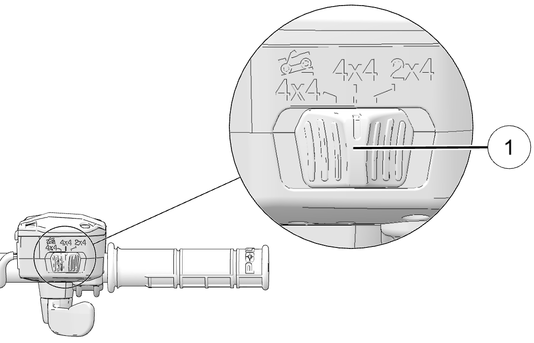 The All Wheel Drive (AWD) system is controlled by the Driveline Switch 1. Use this switch to engage ADC, 4x4, or 2x4. The vehicle automatically engages AWD when operating in forward or reverse if the switch is set to 4x4. For more information, see All Wheel Drive System.