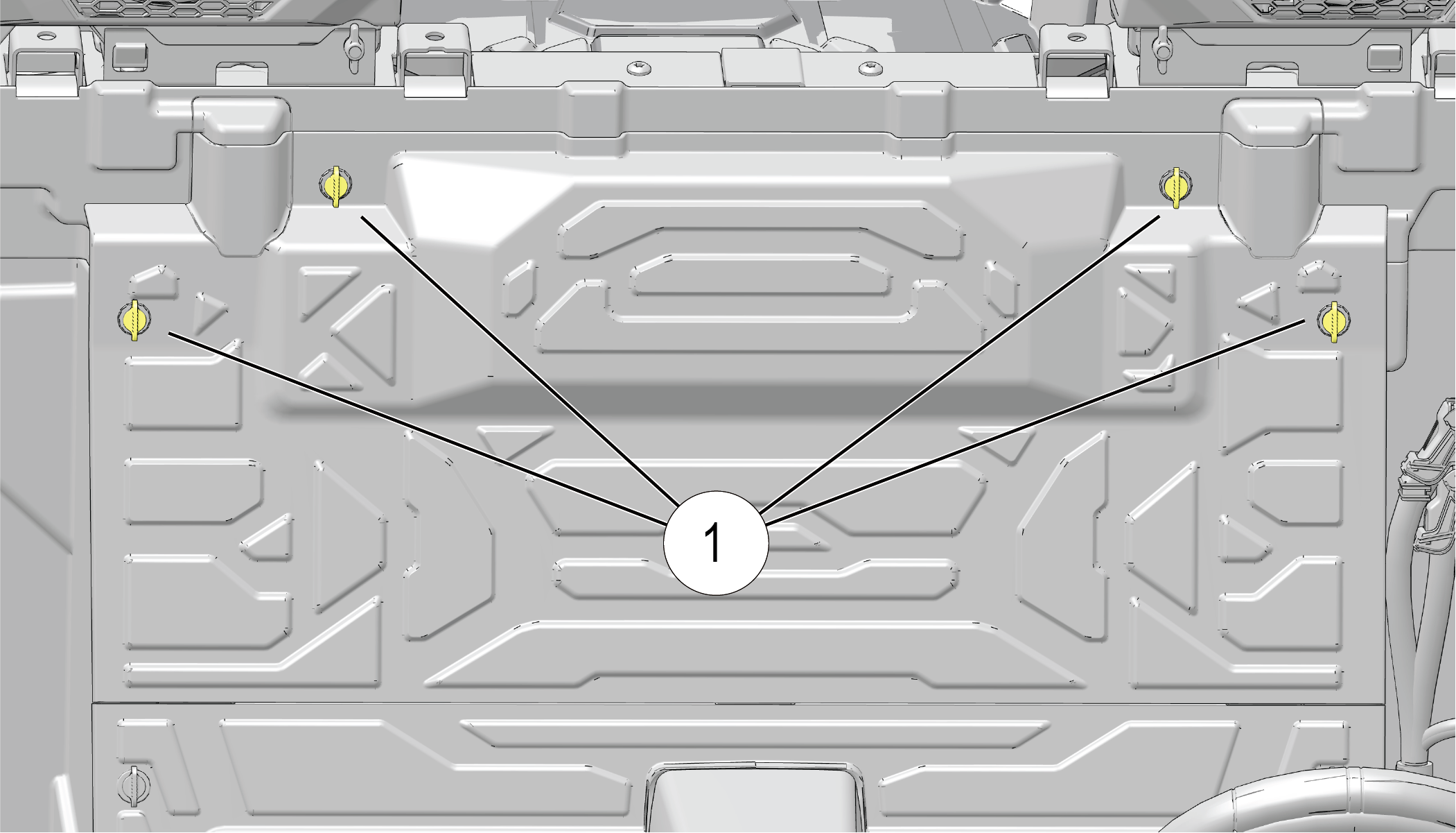 The engine access panel is located behind the seats. Adjust or remove the seats, then remove the panel to reach serviceable engine components. Remove the panel by turning the close-off knobs1 1/4 turn.